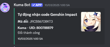 Ngoài ra, Các code sau khi được tự động nhận sẽ được thông báo tại các channel discord: